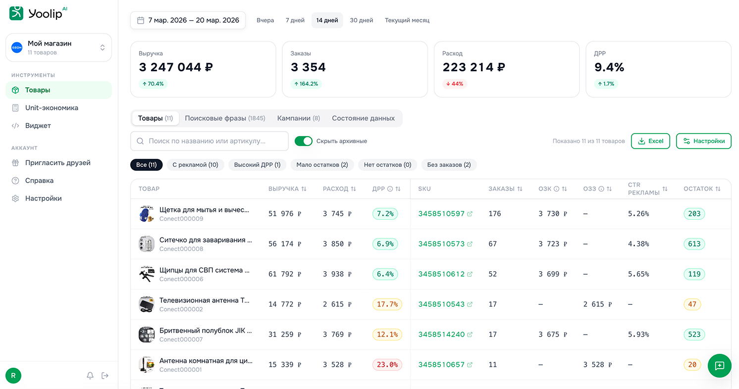 ДРР по каждому товару, расход ОЗК и ОЗЗ, остатки, цены — всё считается автоматически.
